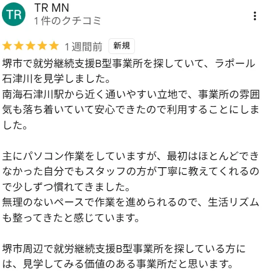 就労移行支援事業所ラポールでは、障害福祉の専門スタッフが、職場定着に向けた実習や就職活動をサポートしています。堺駅から徒歩1分、石津川駅から徒歩3分とアクセスも良好。生活リズムの改善や面接同行支援、就職後の職場定着支援なども含め、あなたの「働きたい」を応援します。現在、無料でオンライン相談・施設見学を受け付けています。訓練内容や就職までの流れ、補助制度の対象など詳しくご案内いたします。就職実績があるからこそ、安心してご利用いただけます。