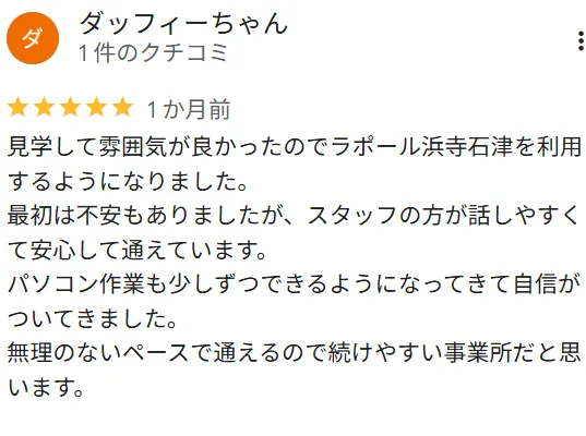 ラポールでは、経験を積んだ職員が多数在籍しております。わからない事や日常の相談事など、ご利用の皆様に寄り添って親身にお伺いしますので、安心してご利用いただけます。「わからないをわからないままで終わらせない」学ぶことの楽しさについて、一緒に学んでいきましょう。