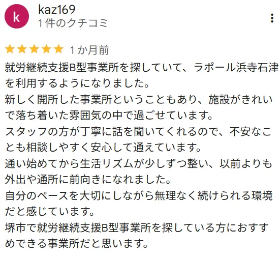 働きたいと思っている方にとって、実際に動き出すには勇気とエネルギーが必要です。就労支援を行う事業所としてその想いを大切にし、無理なく働ける環境を提供しています。疾病や障がいなどの理由で一般企業での就労に不安を感じる方も、ご自身のペースで取り組める作業を通じて少しずつ自信が持てるようになり、体調や生活リズムに合わせながら無理なく続けられるのが特徴です。堺市に3か所の事業所を運営し、一人ひとりの状況に寄り添いながらできることを増やすことで、その人らしい働き方を見つけられるようサポートしています。